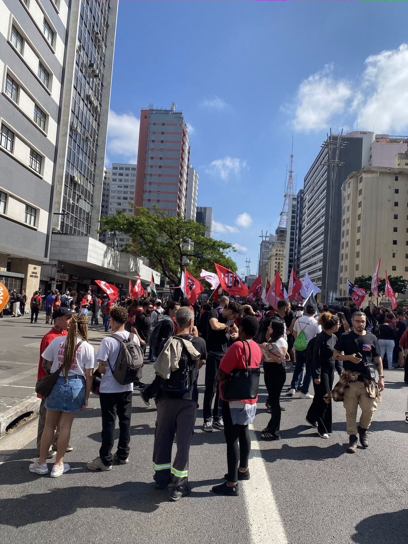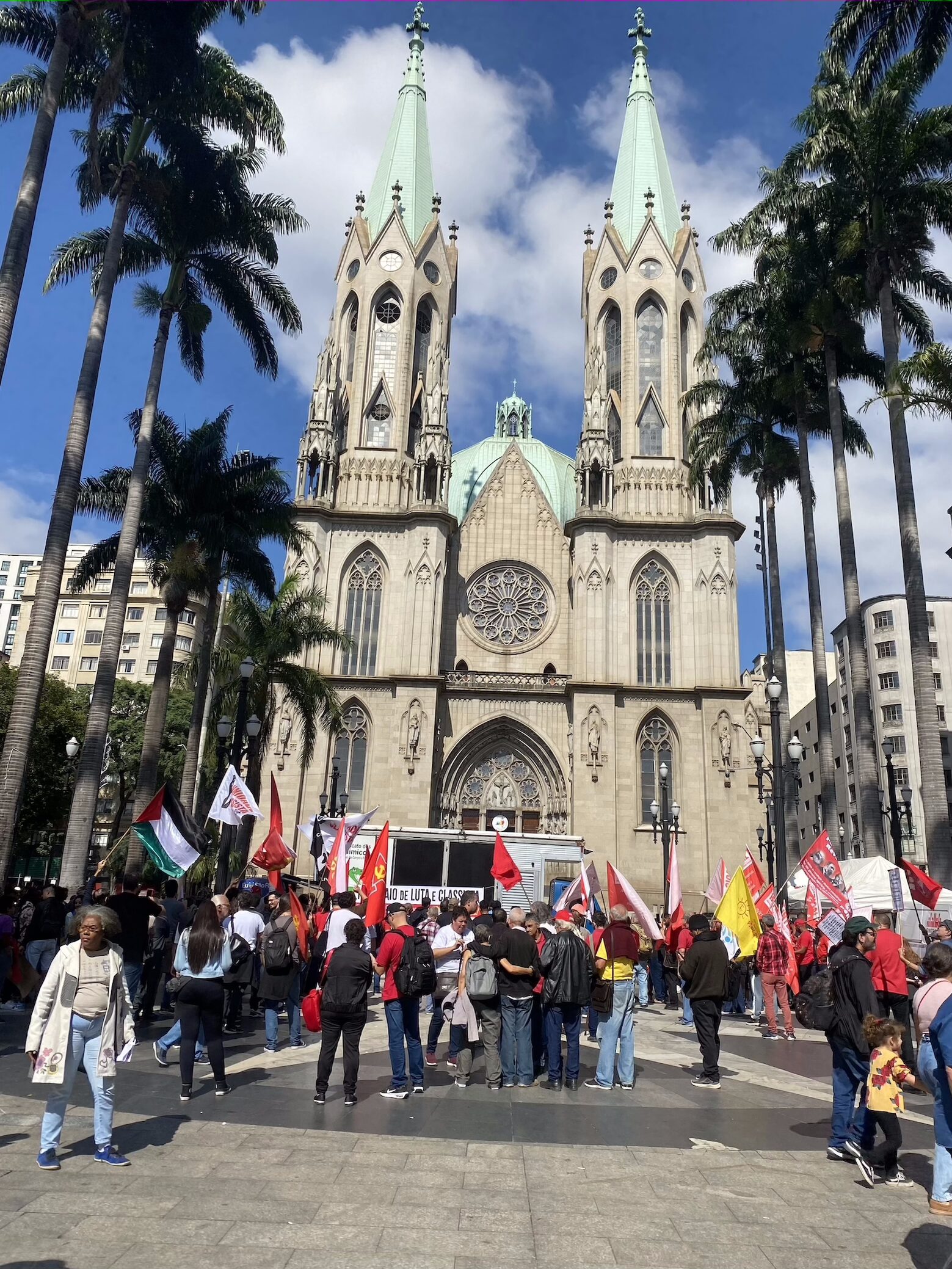 Saindo da Zona Norte, peguei o corredor Norte-Sul, depois de atravessar a Av. do Estado e pedalar mais um tanto, cheguei na Praça da Sé. Ali estava um grupo pequeno de militantes hasteando bandeiras do PCB, da Palestina e um carro de som do SINSPREV. Ouvi umas falas sobre as pessoas trabalhadoras da saúde e de como seria importante convergir as lutas. Tomei meu rumo e saí em direção à Av. Paulista, passei pela Liberdade e não tinha nada acontecendo por ali…