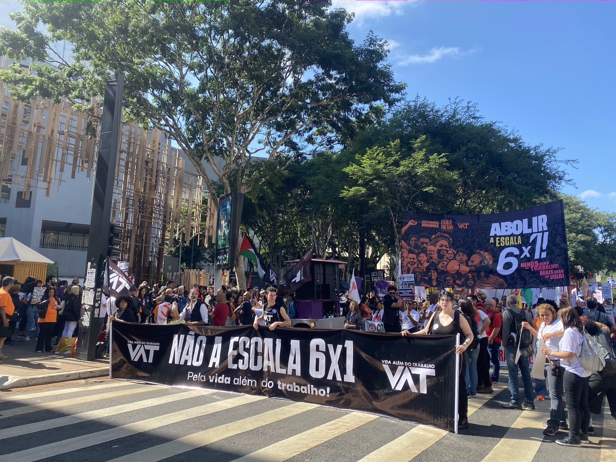 Chegando no MASP, esse estava um tanto maior que os outros três que vi. Bandeira de partido só vi uma, do PSTU no carro de som. A maioria era da CSP-CONLUTAS, outros eram OSL, UJC e MRT. Nesse tinha faixas e bandeiras com mais um tanto de outras pautas, fora o fim da escala 6×1 tinha também denúncias de violência policial, críticas ao Tarcísio etc. Fiquei um pouco, conversei com chegados e pensei, “bom, acho que é isso, vou embora”. Antes de ir, fui dar um pulo lá na outra manifestação. Ela já estava marchando e tinha juntado UP, Soberana, VAT, PSOL e vish… mais uma par de outros e outras. Pensei que todas iriam se juntar e virar uma grande sopa de letrinhas, mas no final acabou que cada uma seguiu seu rumo.