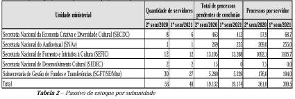 Em seguida, viu-se o fracasso de tentativas na última década, quando do passivo ter passado de 16 mil para 26 mil ao invés de ter sido sanado como exigiu TCU na última força-tarefa criada, chegando ao ponto do desespero da gestão anterior, que tentou cortar o fomento para poder sanar as prestações de contas anteriores. Na gestão anterior da cultura, em 2021, a Secult (MinC) alegou dificuldades operacionais perante o TCU, mesmo após implementar a “regra do equilíbrio”, conforme consta na Nota Técnica nº 47/2021/SEFIC/SECULT, que destacou que março daquele ano registrou a maior captação de recursos desde 1993, evidenciando não haver relação direta entre o número de projetos aprovados e os valores efetivamente captados (TCU, 2021, p. 4; peça 349, p. 2). Apesar da determinação expressa no Acórdão 7.725/2020-TCU-2ª Câmara (peça 87), que exigia a apresentação de um plano para extinguir em três anos o passivo de processos pendentes – sob pena de responsabilização dos agentes públicos envolvidos -, a Secult Mtur (MinC) não conseguiu resolver a questão (TCU, 2021, p. 5; peça 349, p. 4-5). Diante desse cenário, a estratégia adotada foi paradoxalmente reduzir a liberação de editais (informando que o órgão não consegue ultrapassar o teto de prestações de contas finalizadas, superior aos 1.500 aproximadamente ao ano), em vez de implementar mecanismos eficientes para garantir a prestação de contas, agravando ainda mais o problema histórico de gestão. O que também não melhorou os números do passivo de prestação de contas da Rouanet. (OCB, 2025, p.232)