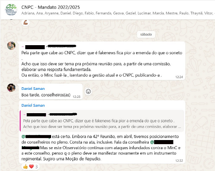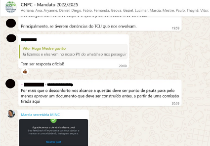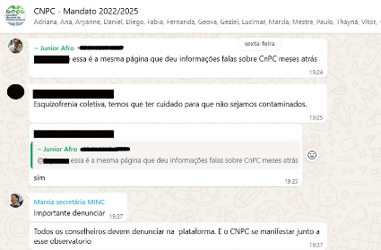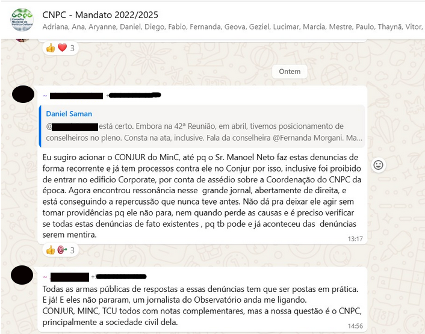 Em seguida, os conselheiros, dentro de esfera oficial de órgão público, sugeriram promover atos de cancelamentos e denúncias das contas da OCB nas redes sociais, em tentativa de retirá-las do ar e promover silenciamento, devido ao OCB tecer críticas ao MinC. Portanto, descumprindo o CNPC de sua função de fiscalizar o Ministério da Cultura, tendo invertido seu papel, para órgão de defesa do governo. Em outra mensagem no grupo, uma conselheira da sociedade civil faz uma série de afirmativas falsas, atribuindo ao OCB (uma rede de pesquisadores) ações e reportagens como se fossem do ex-conselheiro Manoel Neto. Informações estas que não procedem, posto que não consta denúncia de assédio referida abaixo, nem processo na Conjur, ou proibição de entrada em prédio por algum tipo de assédio, mas que supostamente poderia revelar algum ressentimento ou ódio político, o que não faz sentido, já que o pesquisador não é de direita, como afirmado.