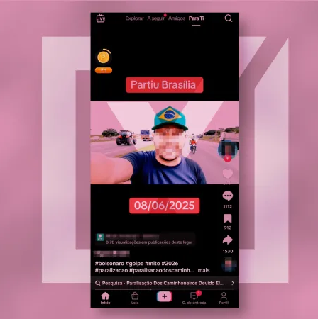A Imagem 01 se trata de uma arte veiculada em 2024 nas redes sociais para divulgação dos atos em prol da libertação dos presos pelo 08 de Janeiro. A Imagem 02, por sua vez, se trata do fotograma de uma série de vídeos curtos que expressava a convocatória de caminhoneiros, entregadores e profissionais do agronegócio em prol da defesa de Jair Bolsonaro, já em 2025.