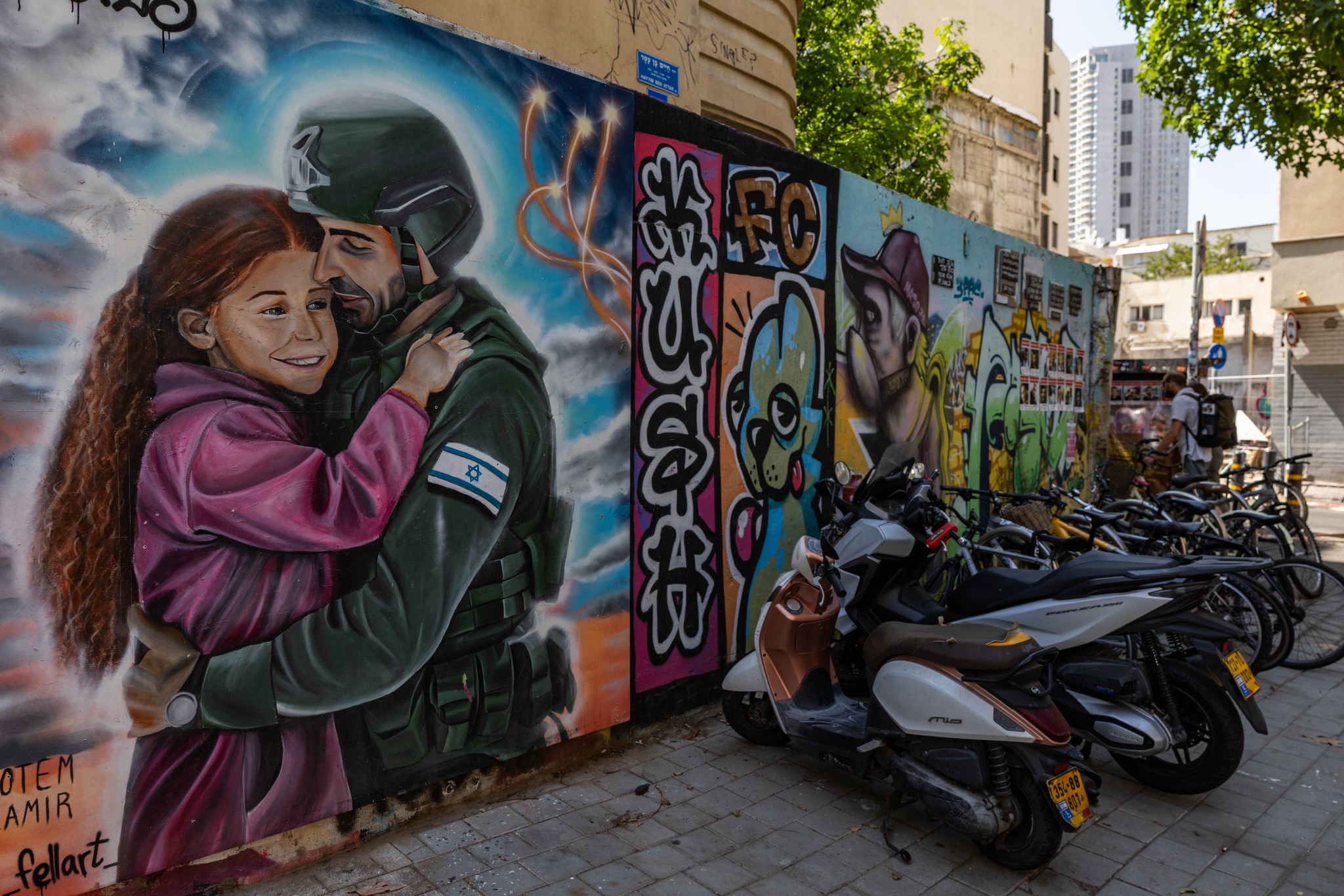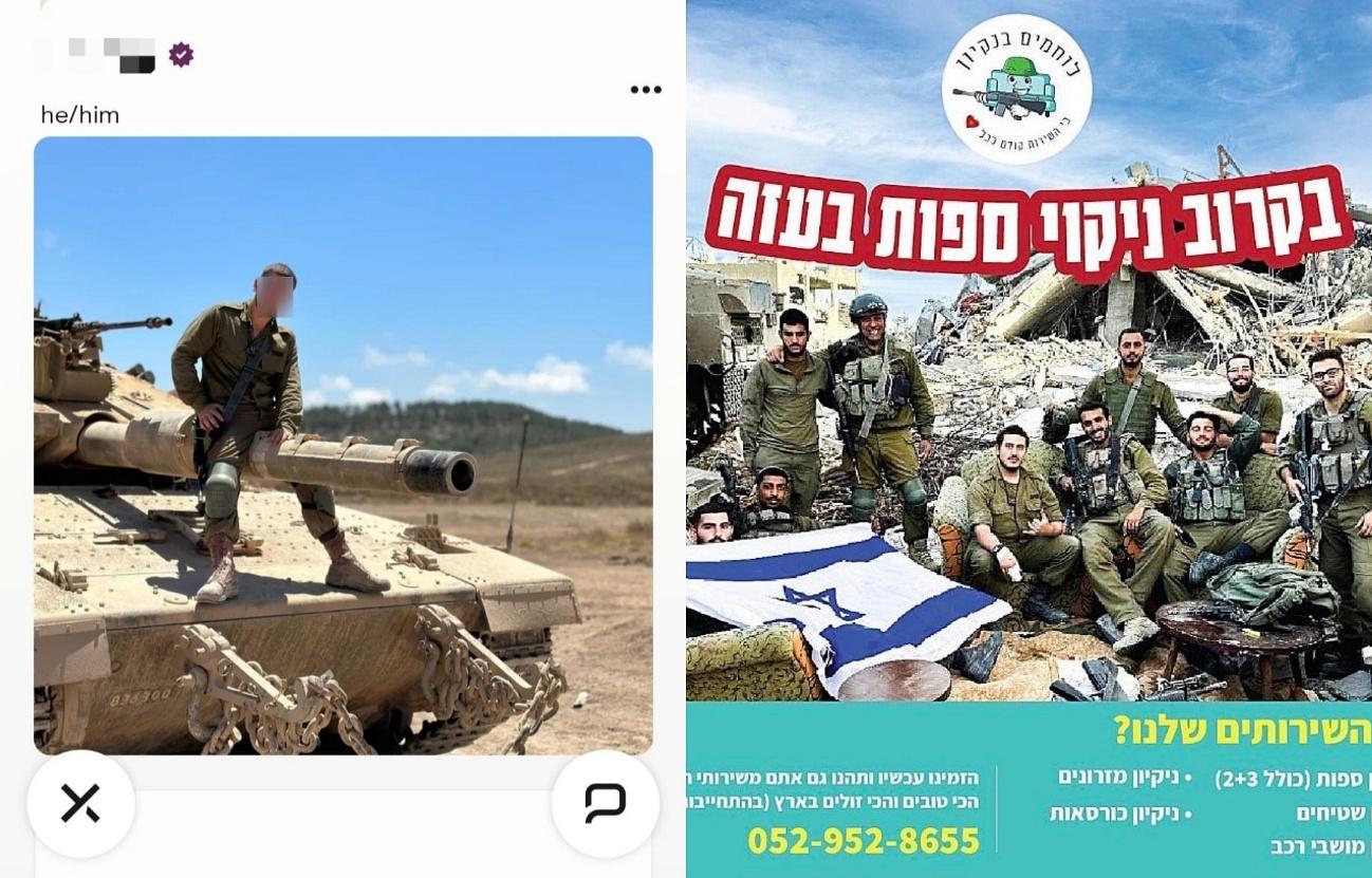 Considere, por exemplo, um anúncio recente de uma empresa israelense de lubrificantes: para o Dia Internacional da Mulher, ela publicou uma série de imagens retratando mulheres soldados (entre elas, uma piloto de caça e uma soldado uniformizada usando a bandana vermelha da Rosie Rebitadeira), cada uma segurando um frasco de lubrificante, acompanhada da legenda: “Ei, gata, você é uma super-heroína”. Ou veja os inúmeros perfis (principalmente masculinos) em aplicativos de namoro que apresentam fotos em uniforme militar, às vezes tendo como pano de fundo a Gaza destruída. Em um desses perfis que encontrei recentemente, um atirador de elite da reserva é fotografado apontando seu rifle para fora da janela de uma casa destruída em Gaza ou no Líbano.